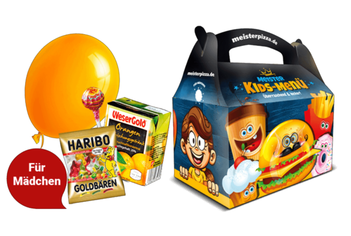 Kids Box mit 1x Orangen-Erfrischungsgetränk (0,2l) und einer großen Überraschungsbox mit Spielzeug, Gummibärchen & Frucht-Lutscher.